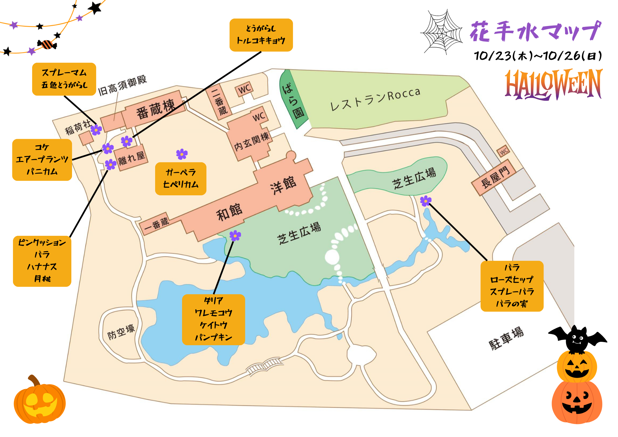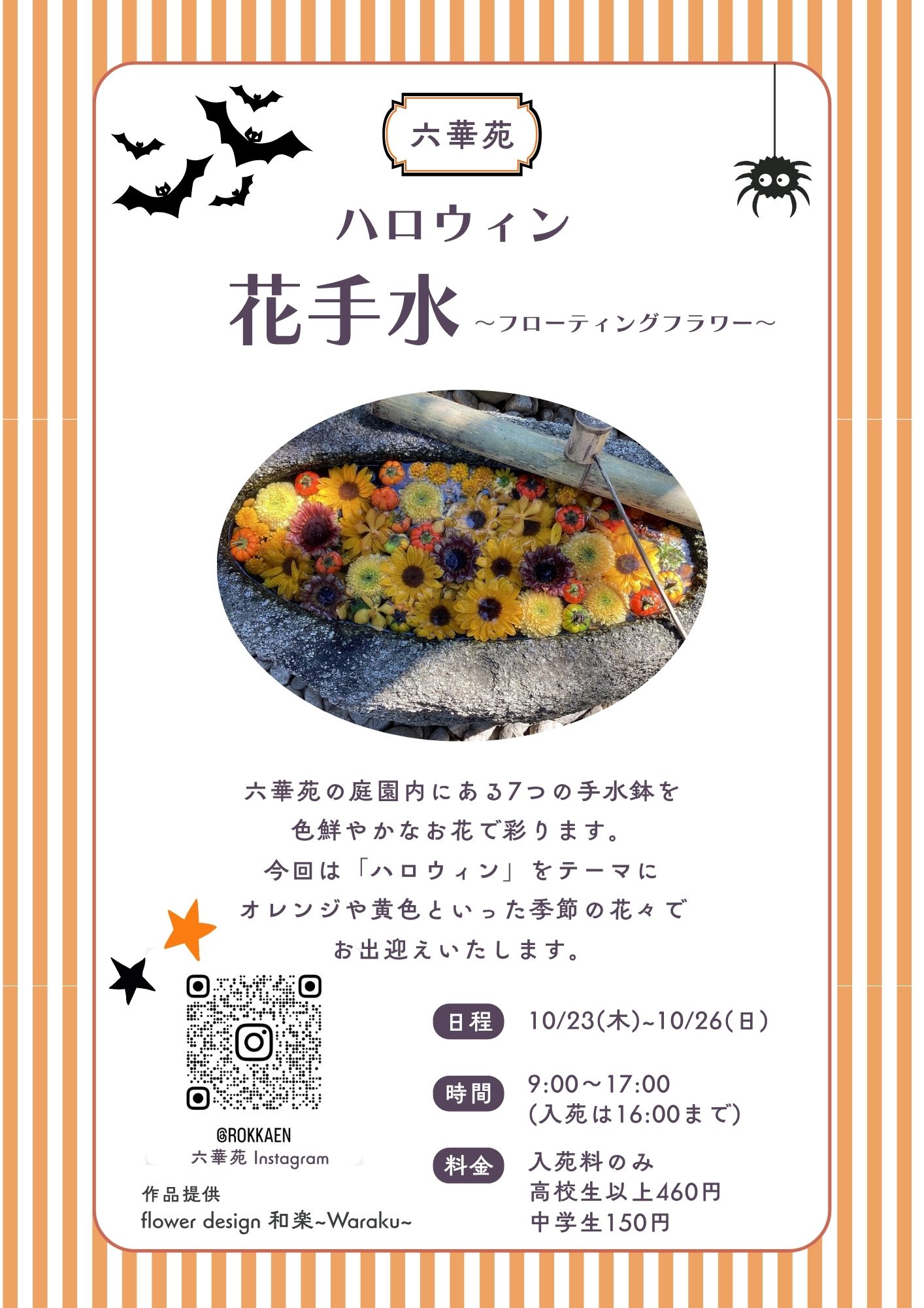 「花手水~フローティングフラワー~」を開催いたします 花手水~フローティングフラワー~ 日時 令和7年10月23日(木)~10月26日(日) 9時~17時(入苑は16時まで) 料金 入苑料でご覧いただけます。(高校生以上460円 中学生150円) 場所 苑内にある大小7つの手水鉢 花手水マップはこちら 内容 庭園内にある7ヶ所の手水鉢を、色鮮やかな花々で彩ります。 今回は「ハロウィン」をテーマにオレンジや黄色といった季節の花々でお出迎えいたします。 チラシ チラシはこちら 協力 flower design 和楽 ~Waraku~